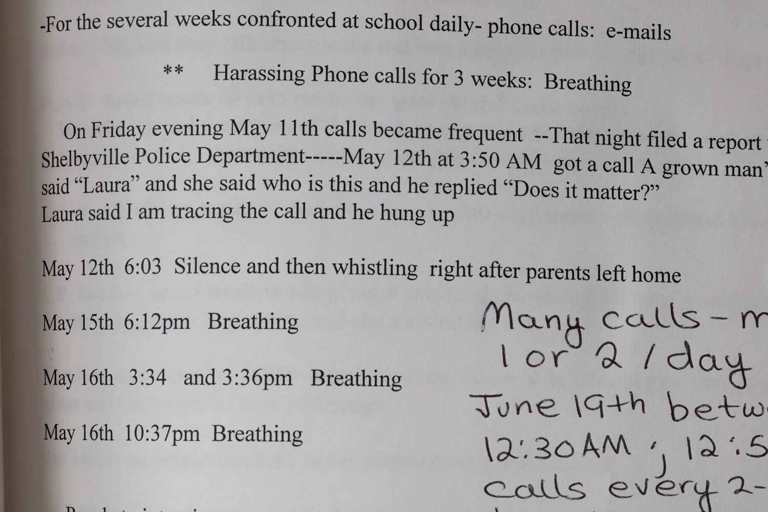 Once the rumor reached my classmates, the harassment became extreme. On Tuesday, May 8th, 2001, the bullying hit a fever pitch and my parents were called to come to the school. I had been verbally attacked by a student in the hallway, who told me he had heard the rumors from three other teachers. I was hysterical. My mother and father met with two staff members at that time, and nothing was done. No official inquiries were made into the situation. To my knowledge, no reports were filed. I was not offered any emotional support. Instead, I was treated as a problem to silence. I was told to simply ignore it and was sent back to fend for myself. On May 11th, we filed a report with the Shelby County Police Department about repeated sexual phone harassment to our home phone.